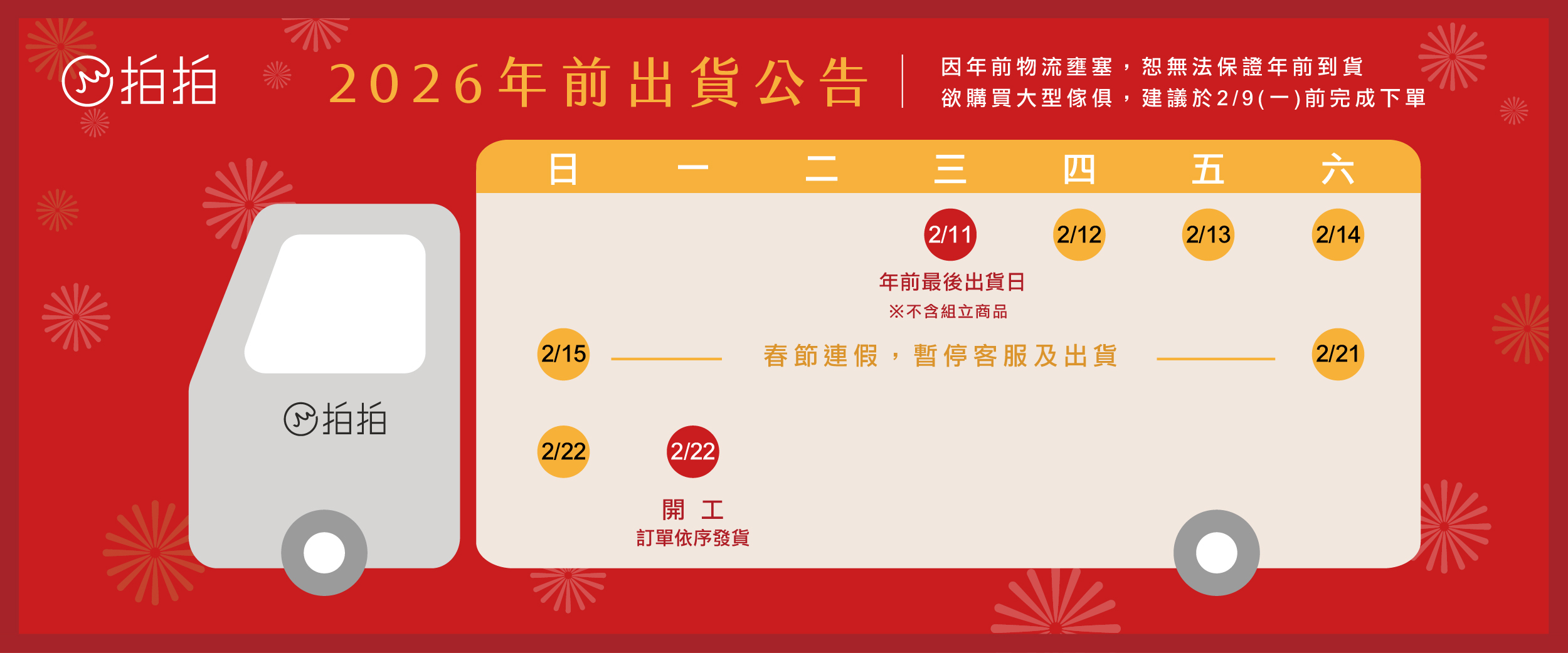 【春節連假出貨公告】 即日起-2/13(五)為春節連假前為物流高峰期,配送時程可能有所延誤。 ⭐2/12(四)-2/22(日)將暫停出貨服務,期間訂單將於2/23(一)開工日起依序出貨⭐