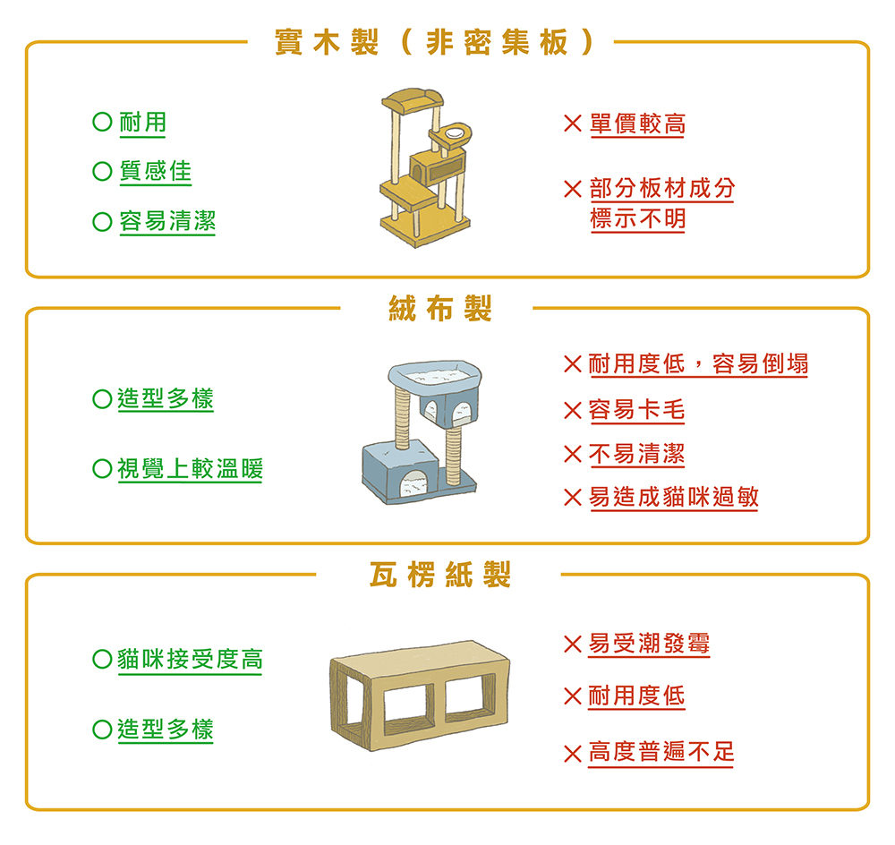 貓咪常會掉毛、嘔吐,建議選擇木質好清潔或防水材質。