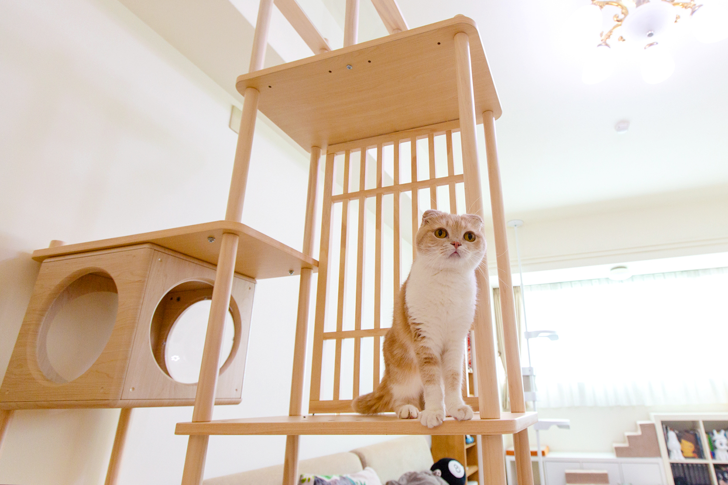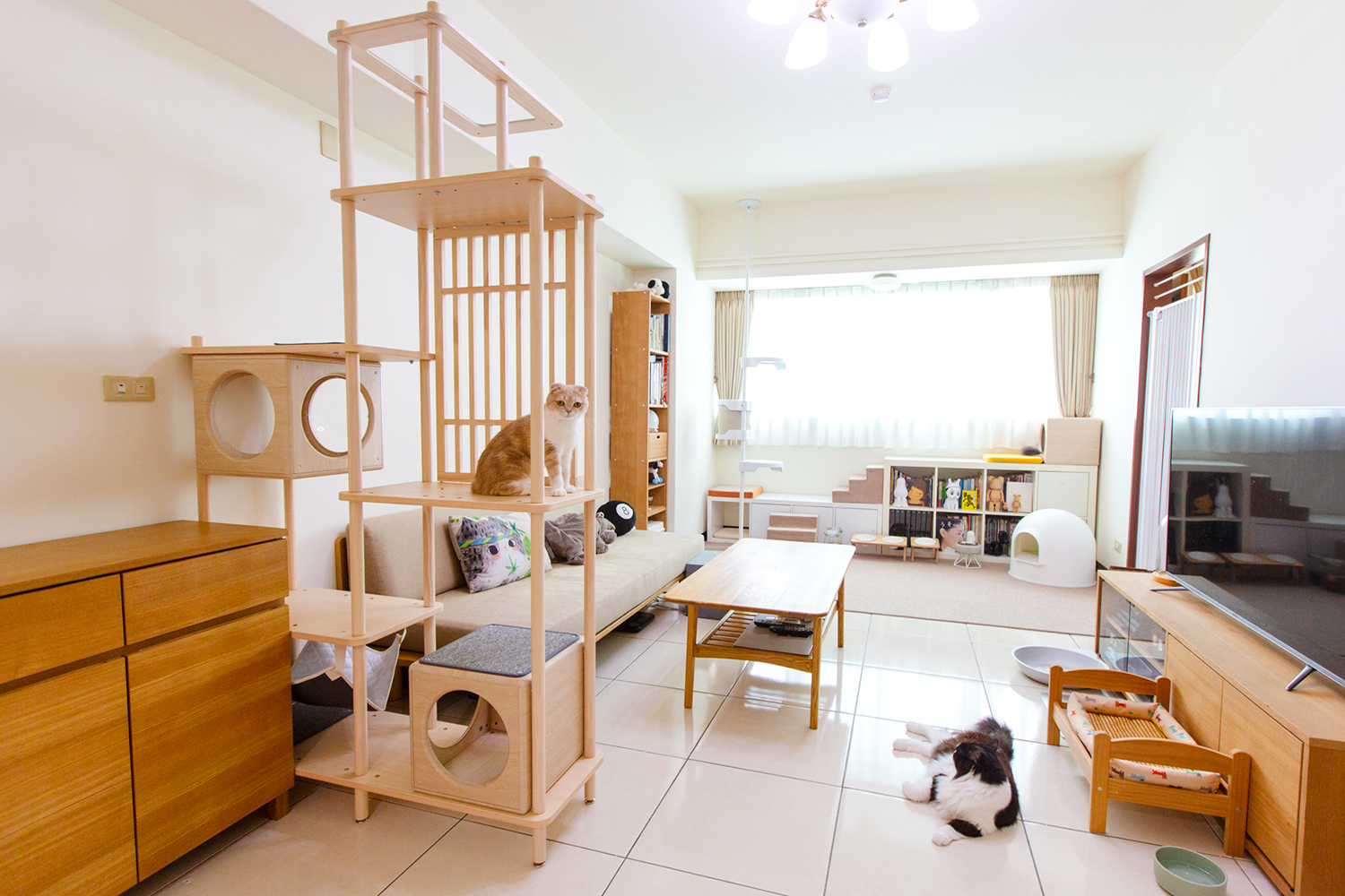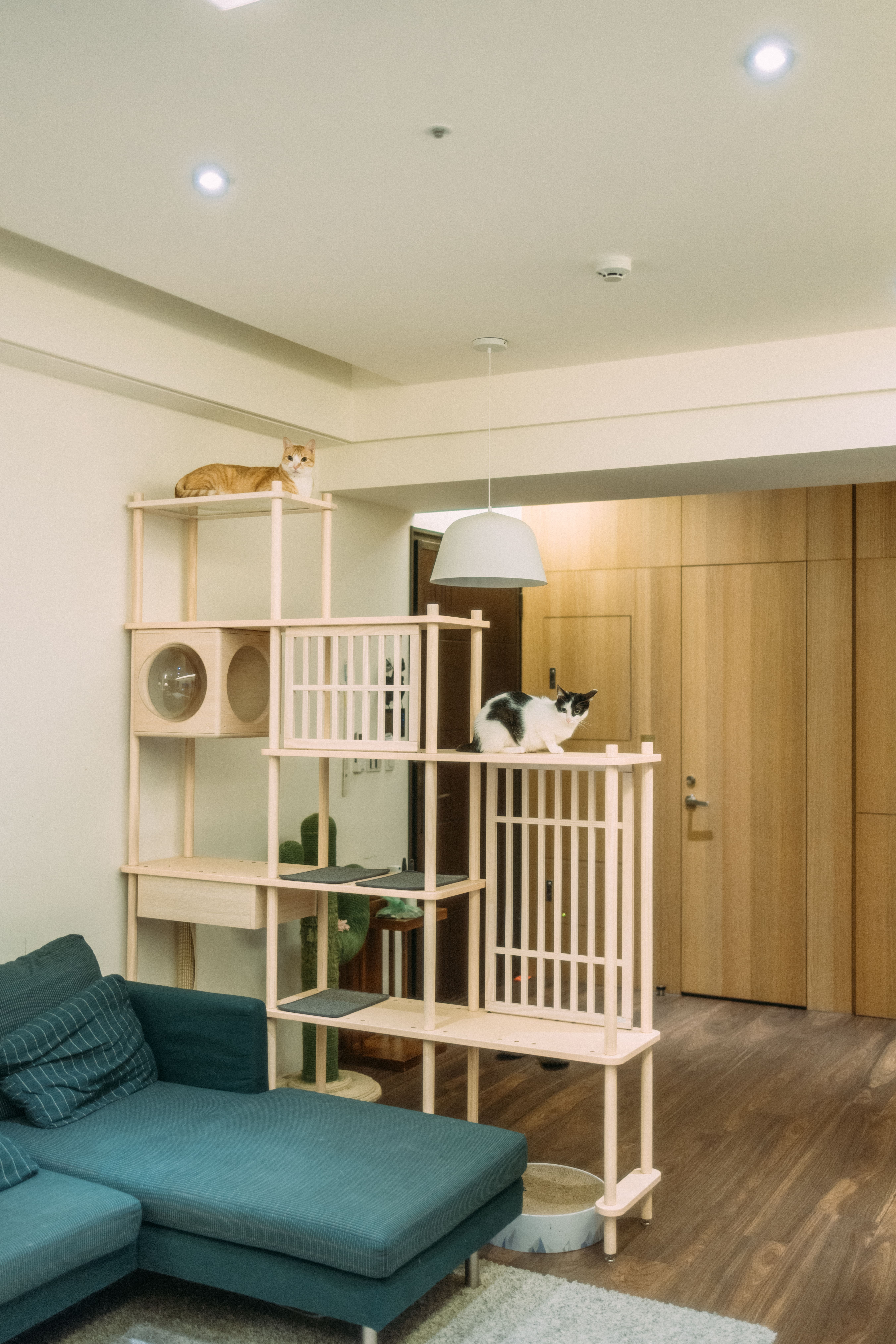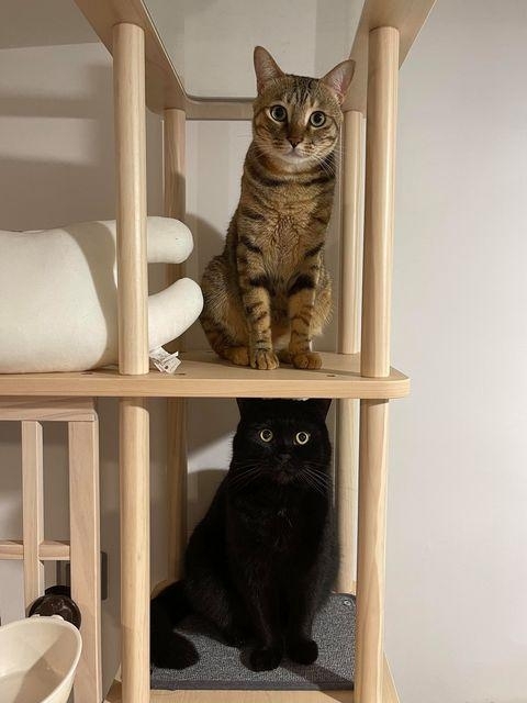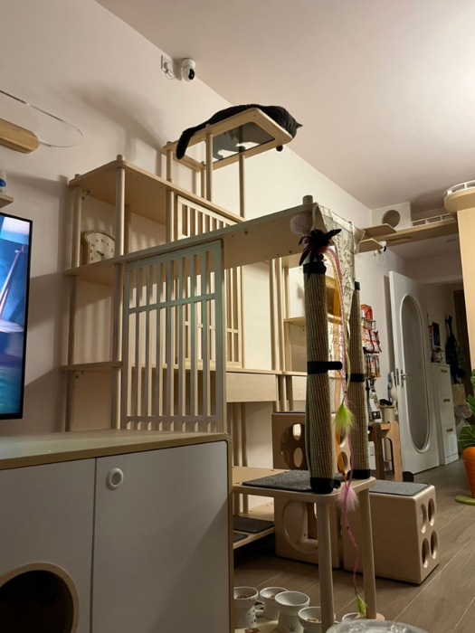 凹凹和拉拉都很愛在上面玩耍睡覺,不只貓貓滿意貓奴也滿意。視覺上的穿透感不會覺得客廳變小,也不會擋到冷氣,家裡感覺還變溫馨了,真的太喜歡了。