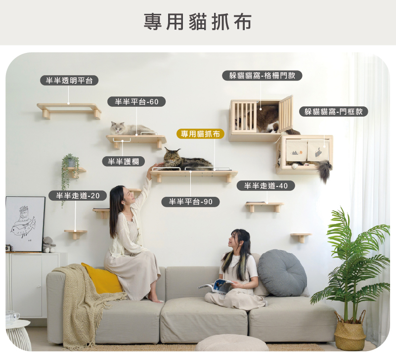 ・本商品不含「半半走道」,需於賣場另外購買,僅「半半走道」系列方能安裝半半走道專用貓抓布。