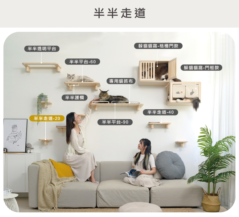 ・本商品不含「半半走道專用貓抓布」,需於賣場另外購買,僅「半半走道」系列方能安裝半半走道專用貓抓布。