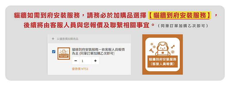 ★貓牆如需到府安裝服務,請務必於下方加購品選擇【貓牆到府安裝服務】,後續將由客服人員與您報價及聯繫相關事宜。(同筆訂單加購乙次即可)