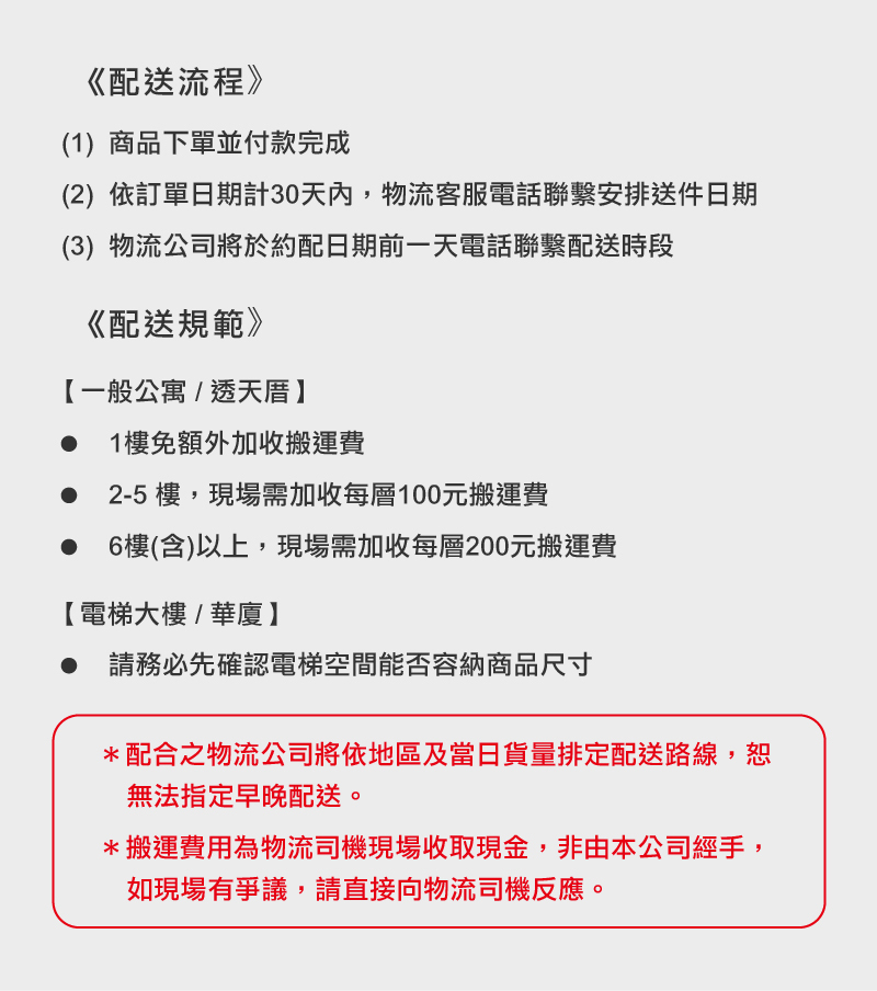 ・物流僅配送至1樓,樓層搬運費另計!詳下面配送規範說明。