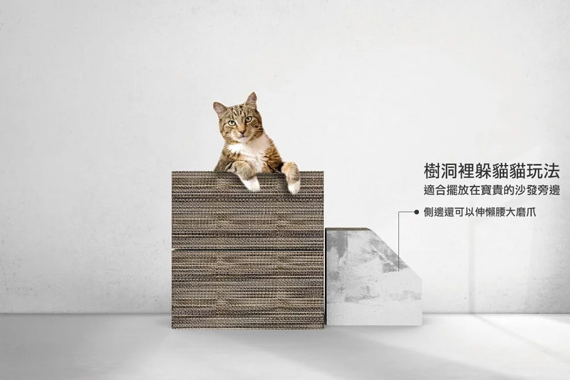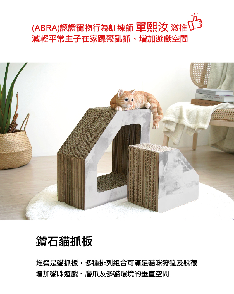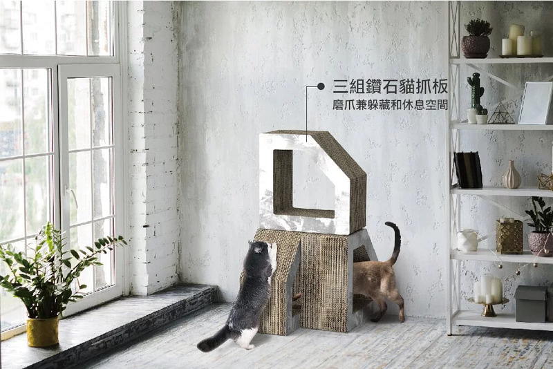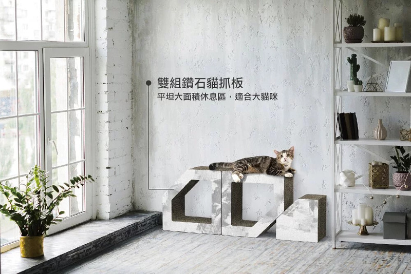 拍拍與寵物訓練師單熙汝協力開發鑽石貓抓板,堆疊式的設計與排列組合,增加貓咪遊戲、磨爪和休息的空間;一邊磨爪一邊玩樂,是奴才必備的養貓神物!