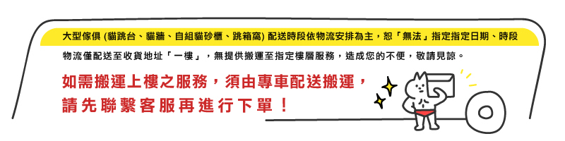 ・配送時段依物流安排為主,恕無法指定早晚配送;物流僅配送至收貨地址一樓,無提供搬運至指定樓層服務。