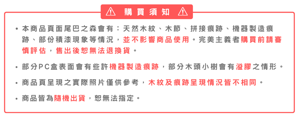 .尾巴之森為天然木頭製造,紋路拼接色差、樹結斑點屬自然現象