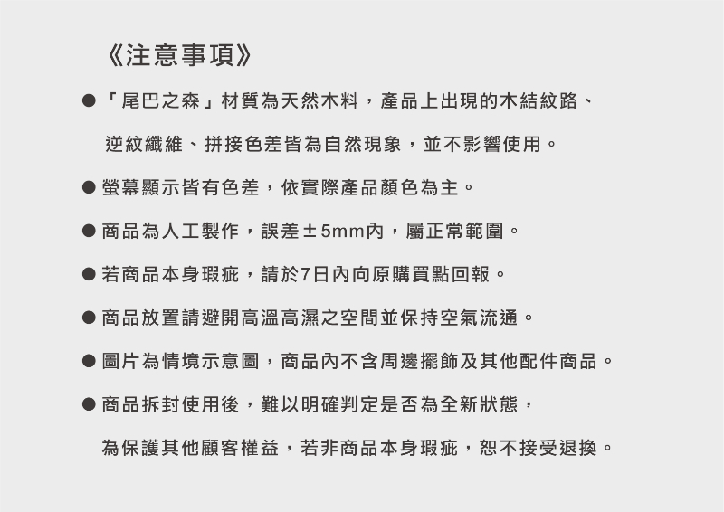 .尾巴之森為天然木頭製造,紋路拼接色差、樹結斑點屬自然現象