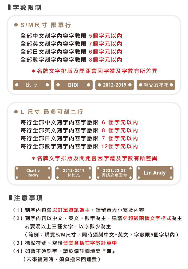 ・如無填寫將寄出空白名牌,到貨後如需補刻需自行聯繫客服並寄回名牌