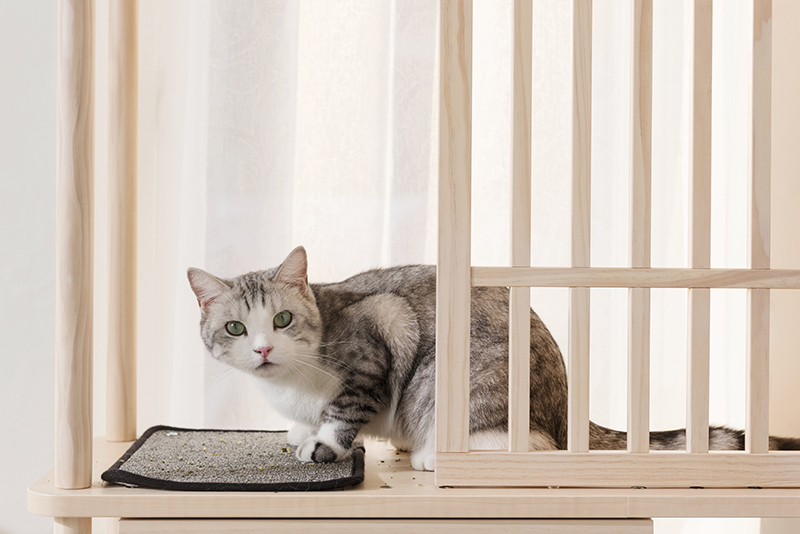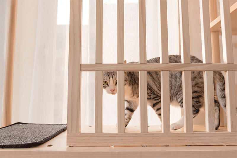 貓咪穿梭其中,透過格柵產生若隱若現的景深感,增添寧靜禪意氛圍。