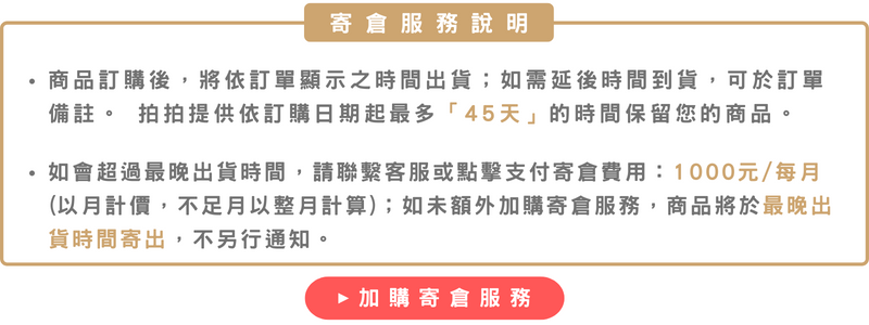 ・商品訂購後,將依訂單顯示之時間出貨。如需延後時間到貨,可於訂單備註,拍拍提供依訂購日期起最多「45天」的時間保留您的商品,商品將於最晚出貨時間寄出,不另行通知。如需延長寄倉時間,將額外收取寄倉費用,請聯繫客服支付寄倉費用。