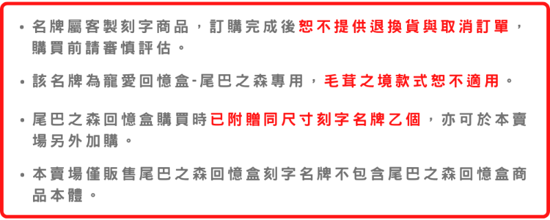 ・尾巴之森回憶盒購買時已附贈同尺寸刻字名牌乙個,可於此賣場另外加購