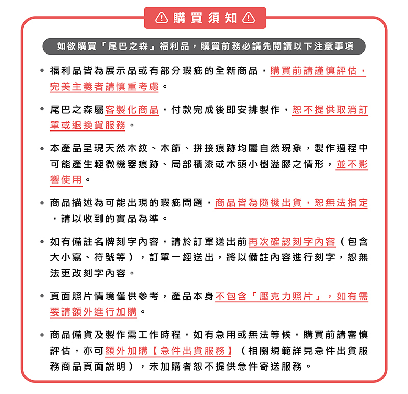 .尾巴之森為天然木頭製造,紋路拼接色差、樹結斑點屬自然現象